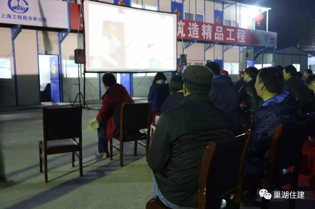 3月31日晚,巢湖市住建局志愿服務隊為巢湖三水廠項目部一線工人送去熱映大片《反貪風暴》,這預示著巢湖市住建局2017年“百部電影進工地,安全教育伴你行”志愿服務項目正式啟動。